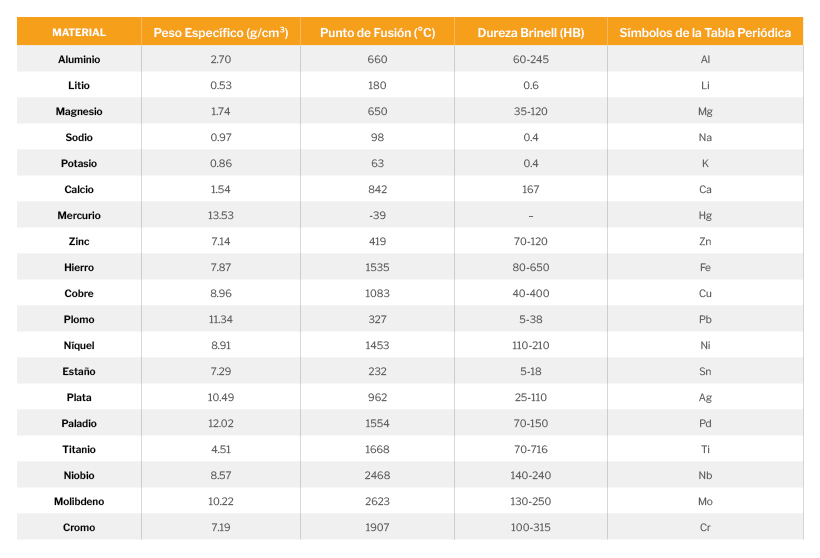 🧮 Tabla de los materiales metálicos más usados en la industria