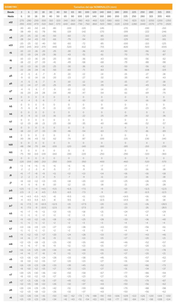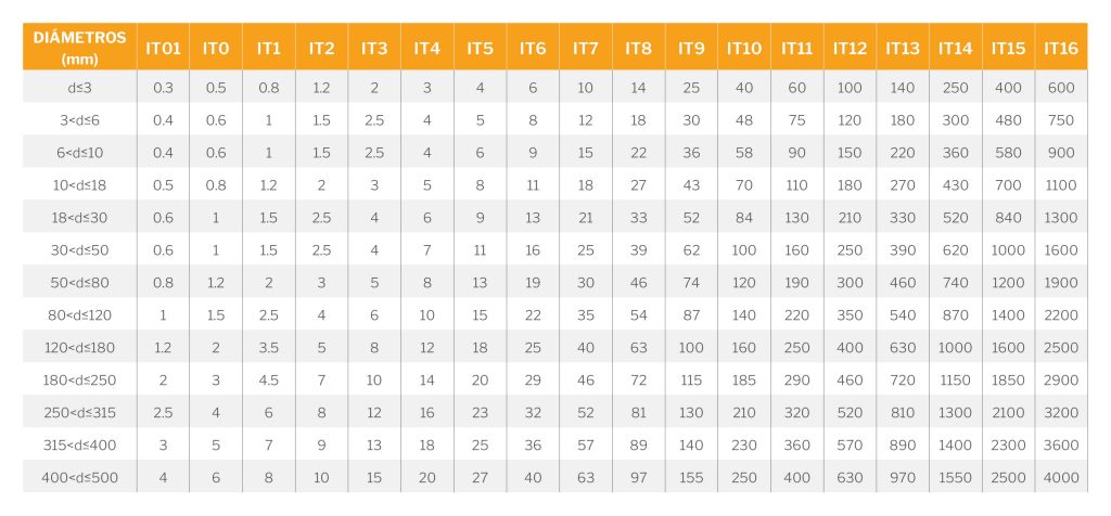 Los números que se aprecian en la tabla de tolerancias son en micras o milésimas de milímetro.
