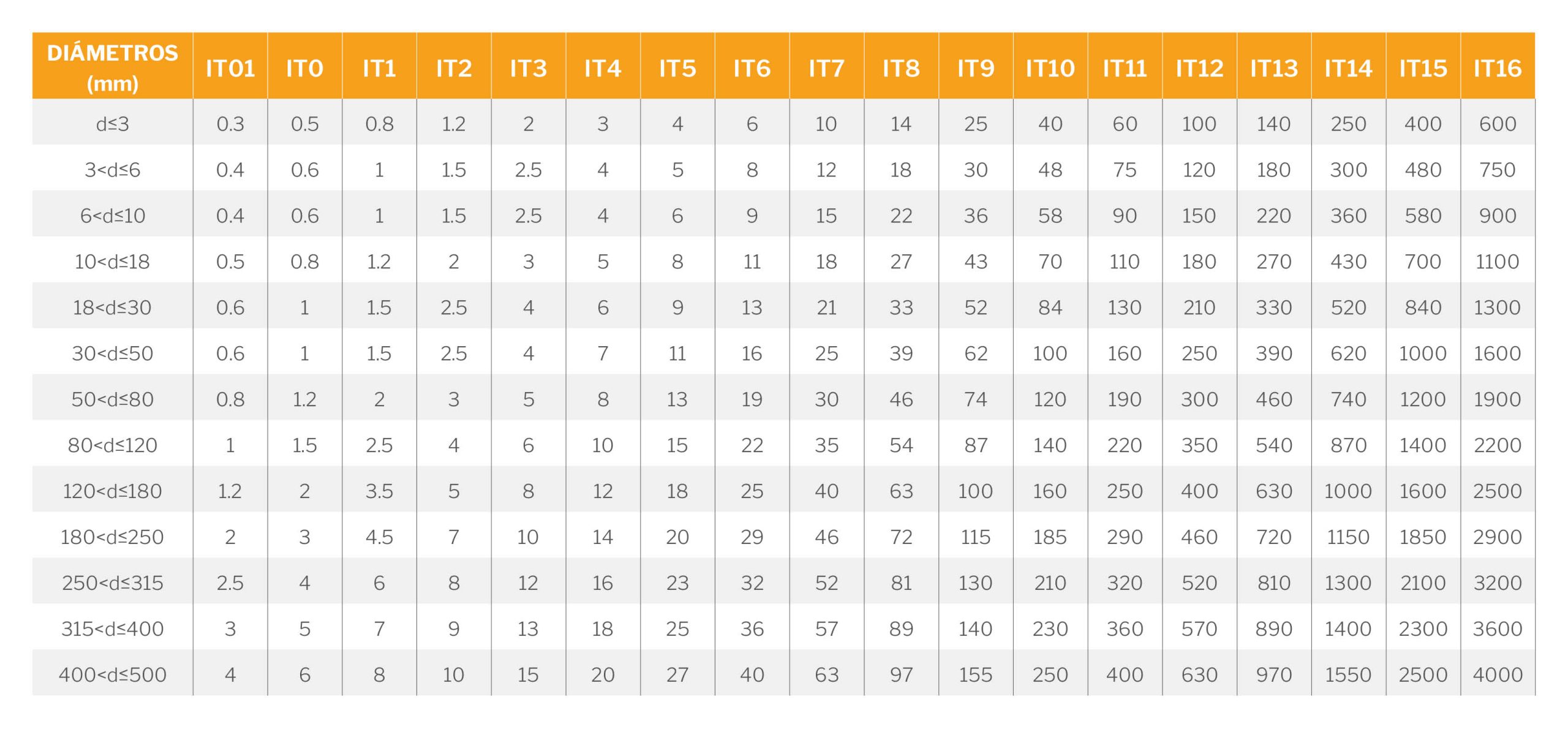 Los números que se aprecian en la tabla de tolerancias son en micras o milésimas de milímetro.